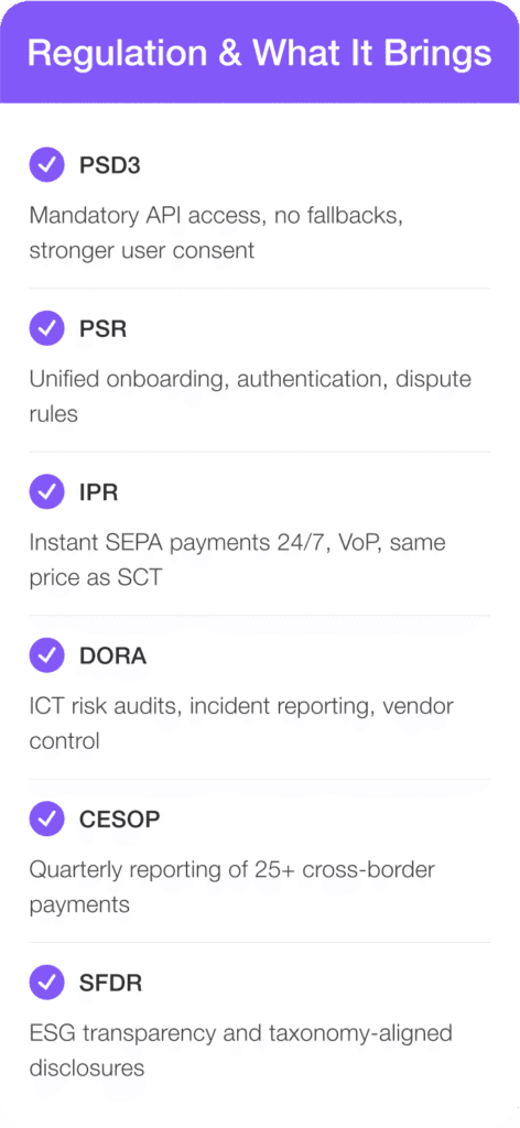 - Fully PSD3-compliant APIs with SCA, VoP, and tokenisation built-in;
